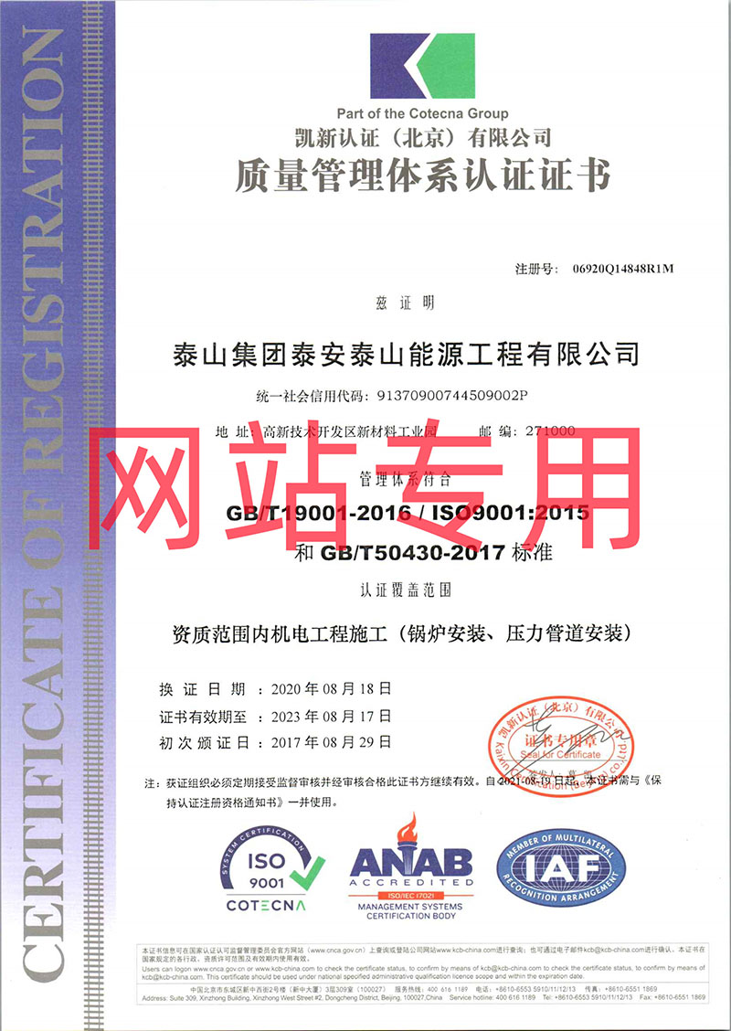 質量管理體系認證證書(鍋爐、壓力管道安裝)